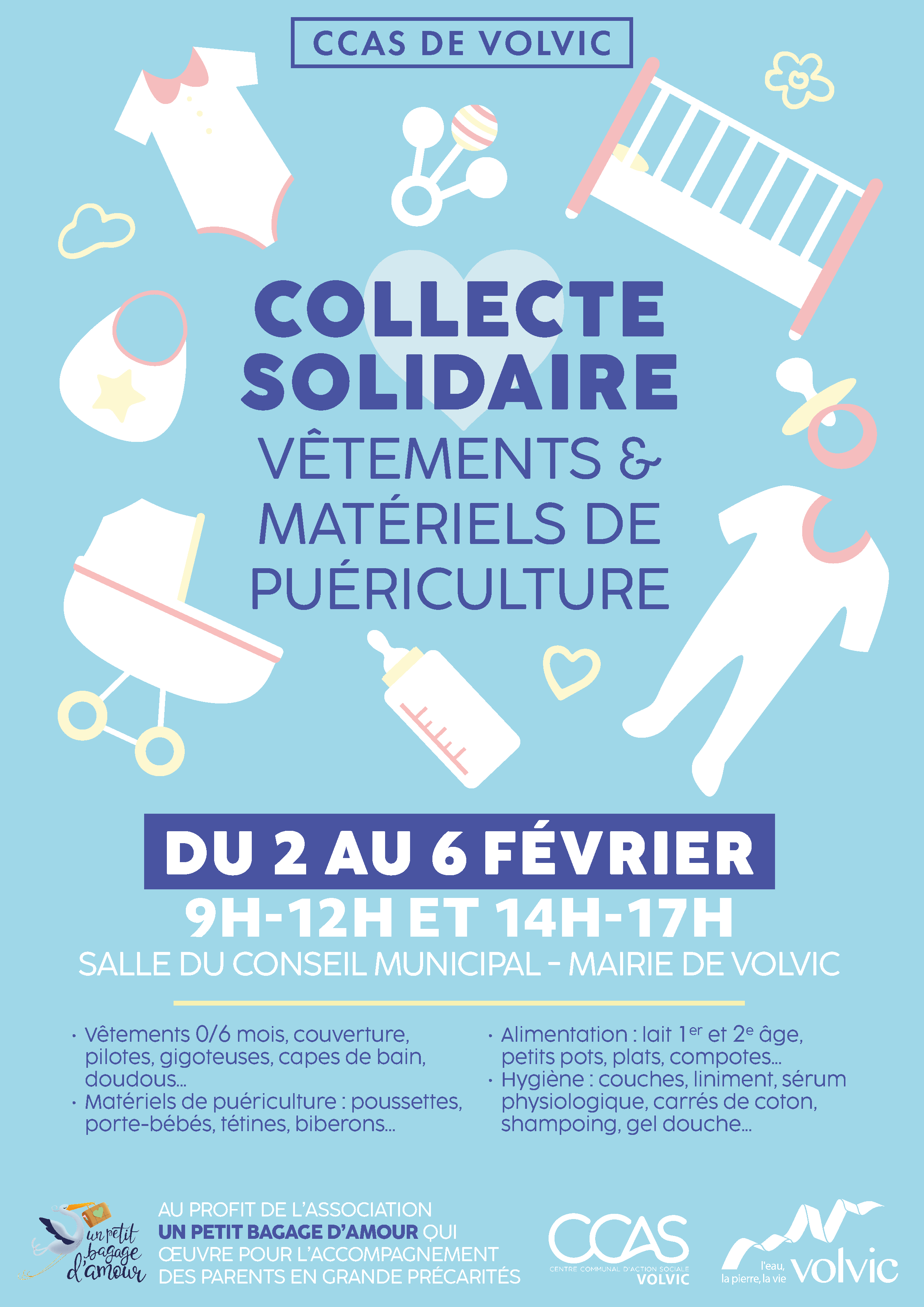 Du 2 au 6 février, le CCAS de Volvic organise une grande collecte solidaire au profit de l’association “Un petit bagage d’amour” basée à Clermont-Ferrand et qui œuvre pour l’accompagnement des parents en grande précarité.